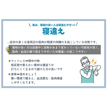 長時間にわたって首がおかしな方向に曲がったままになっていると、首の筋肉が部分的な阻血状態になり、筋肉も凝り固まりやすくなります。