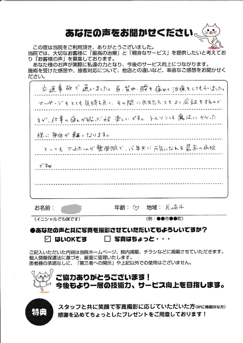 開業以来、肩こり・腰痛・交通事故によるむち打ち症・スポーツ障害など、数多くの方々のお身体の不調と真摯に向き合ってまいりました。