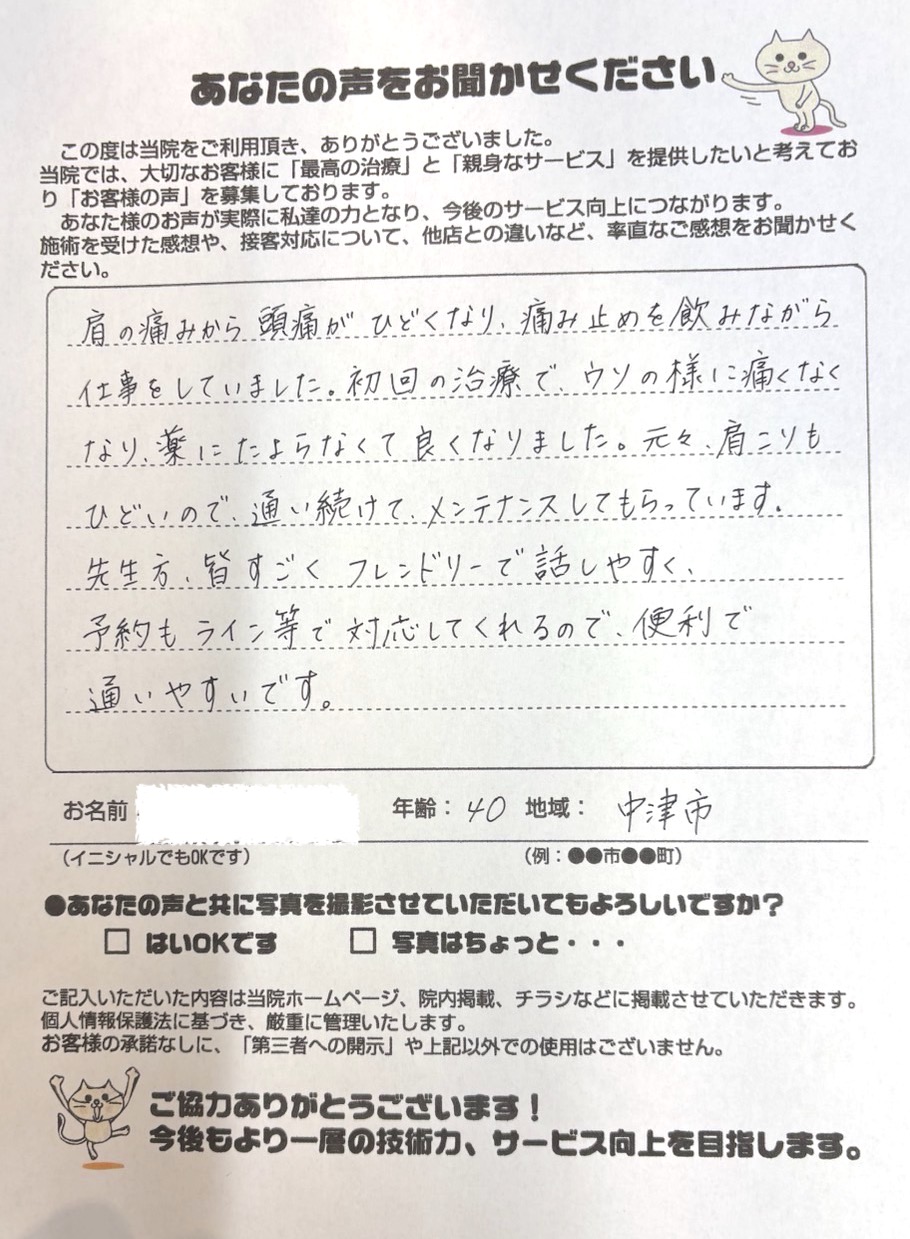 どこ行っても治らないと諦めている方を1人でも減らし、手術しなくても治りたいと思う方のサポートがしたいと日々思いを胸に施術にあたっております。